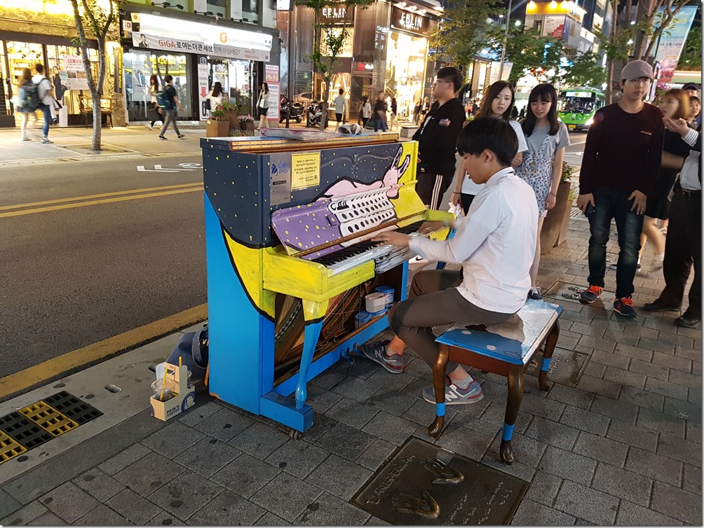 新村站其實是我這趟旅遊中意外喜歡的一個地方,因為人並不會太多,而且街上的店都很不錯,店員的英文又很好溝通。更有趣的是一到傍晚,路上都會有不少街頭藝人表演,而照片中這架鋼琴就是一直擺在這邊讓所有民眾想彈琴時就可以坐下來使用的,有不少高手都直接上場演出,非常有趣。