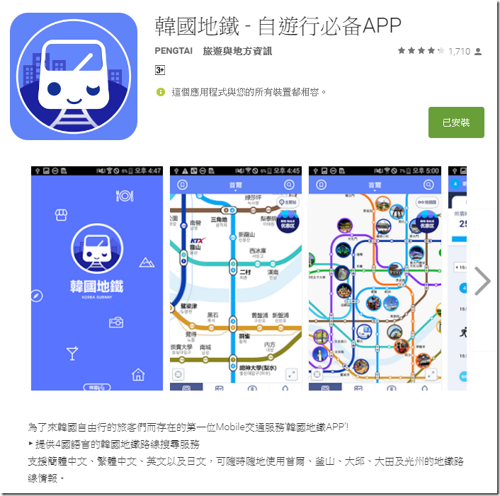 另外還有這趟旅途中,韓國地鐵這 APP 讓我在出門前就可規畫好行程與知道怎麼轉車會比較方便,建議到首爾自助旅行時要下載這 APP 來做為輔助。