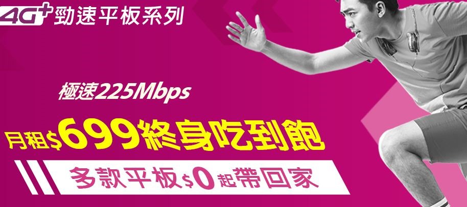 此次所推出的「4G勁速平板」專案,針對不同族群上網用量需求,量身打造全新資費選擇:最低月租$499即可享每月5GB免費傳輸量、data無限遞延優惠,適合中高齡族群平時使用平板上社群網站、追連續劇或與兒孫視訊等需求;針對25-34歲主要平板使用族群,更提供月租只要 $699 即可享極速 225Mbps 終身上網吃到飽優惠,滿足該族群平時追劇、網路購物、甚至因工作所需要隨時上網接收資訊及查資料等高用量行動上網需求,輕鬆享受4G+行動上網快感無負擔!