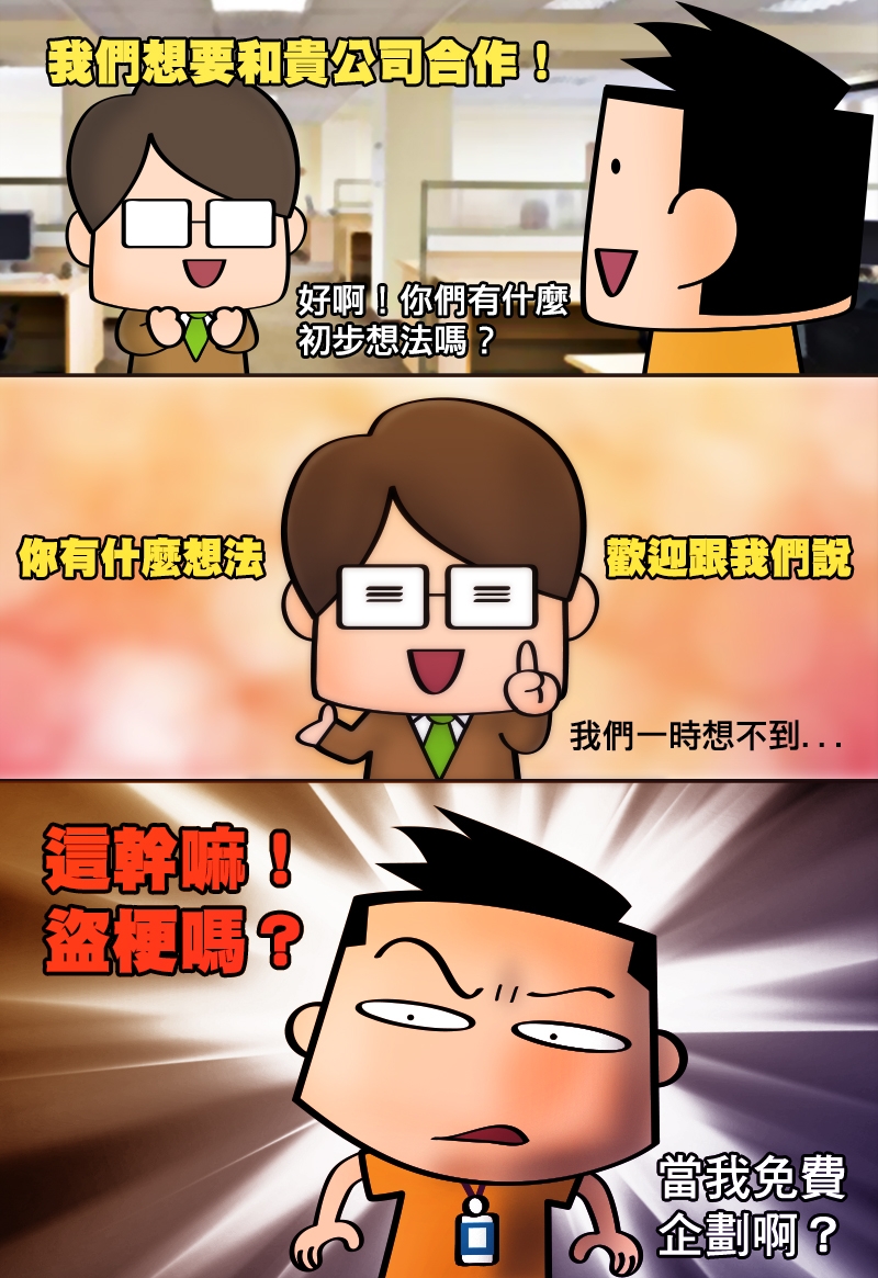以前大學同學昨天去客戶那邊被氣得要死,跑來跟我訴苦,主要是有公司找他們合作,但該公司卻沒有什麼想法,希望他們可以提一些做法給他們(for free),結果後來提一些不錯的 idea 給他們,結果該公司最後卻沒找他們合作,還盜用了他們的 idea…