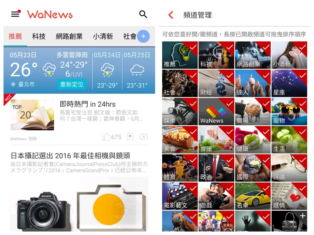 WaNews 採用淡色系介面,使用起來格外舒適,APP 中還貼心的附上所在位置的天氣預測,讓使用者關心時事之餘還可以關心一下目前及未來幾天的天氣狀況。此外,WaNews 內建許多頻道,不管是要科技、網路創業,還是叫親民的食譜、健康、娛樂,想得到的分類 WaNews 幾乎都有。