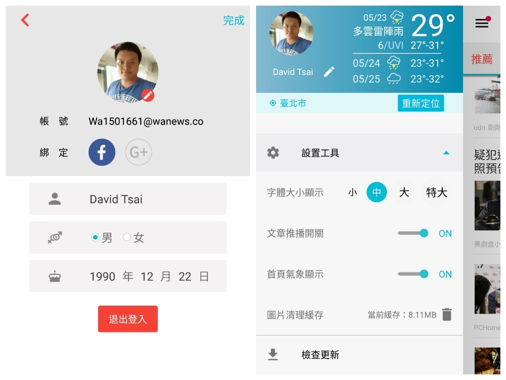 打開 WaNews 後可以看到,使用者可以透過 Facebook 及 Google Plus 來進行帳號綁定,未來只要登入帳號,就能同步綁定的帳號中的所有設定、收藏。此外,WaNews 還提供字體大小、文章推撥開關等選項,使用者可以依照個人喜好來自定。