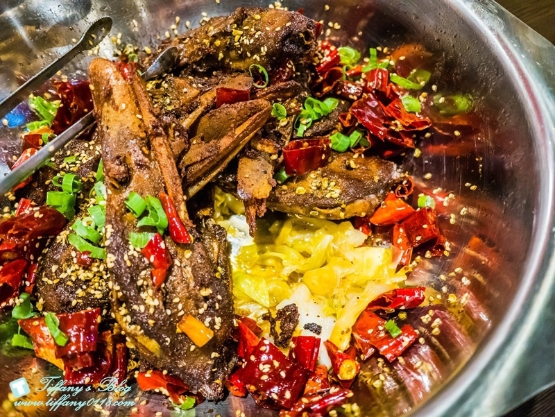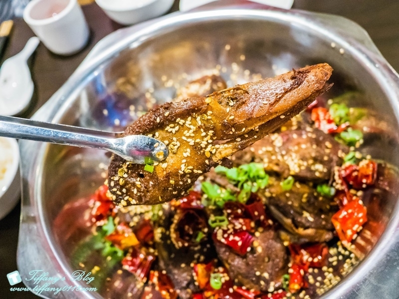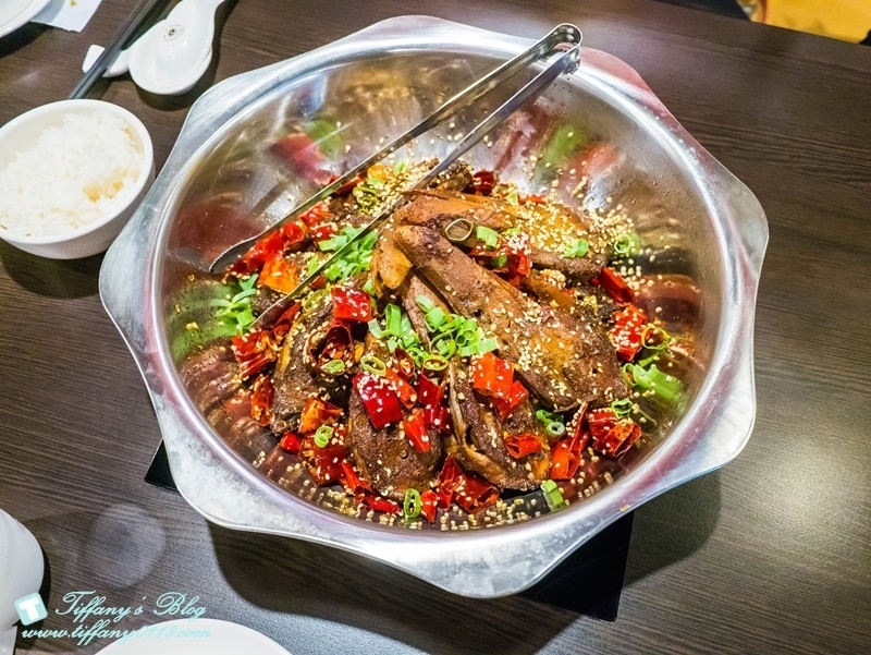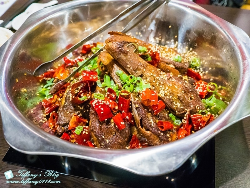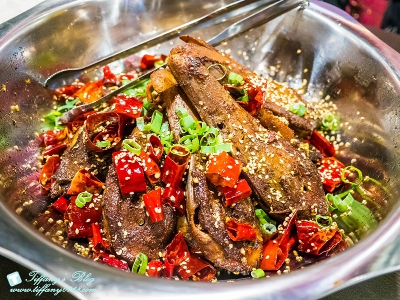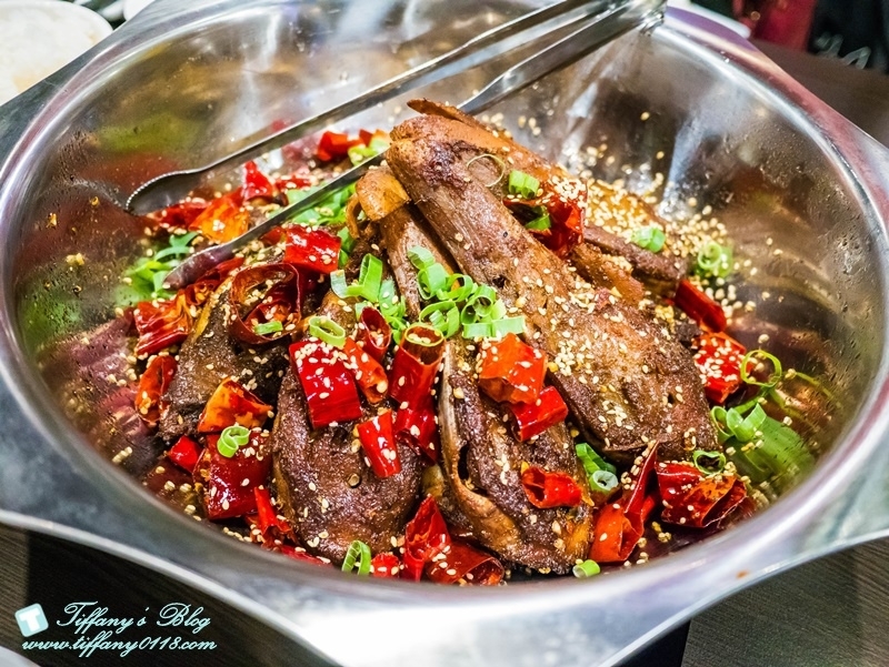 一整鍋送上桌時那香味超級吸引人,乾鍋鴨頭的做法很繁複,先白滷去腥味後再醬炒,最後用老油熬煮…再用一些中藥材像花椒~八角等配料下去滷製的,辣椒有點像是裝飾,但實際去吃是會辣的,愛吃辣的人也可以請店家在辣度上做大辣的調整喔!!