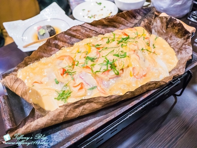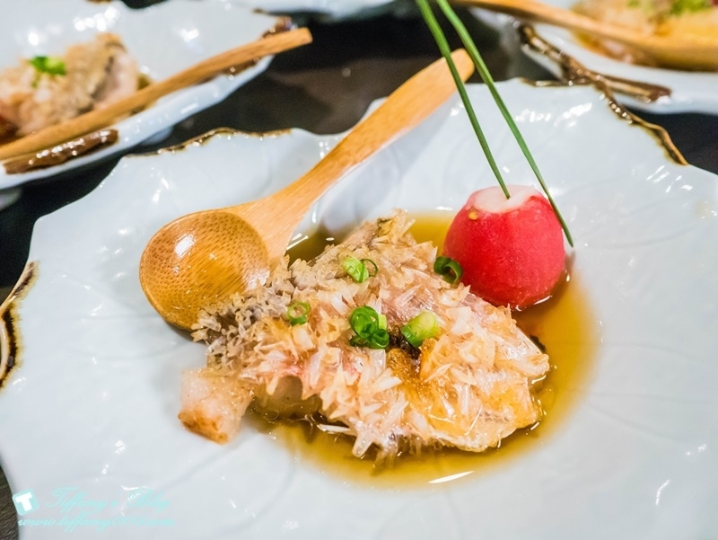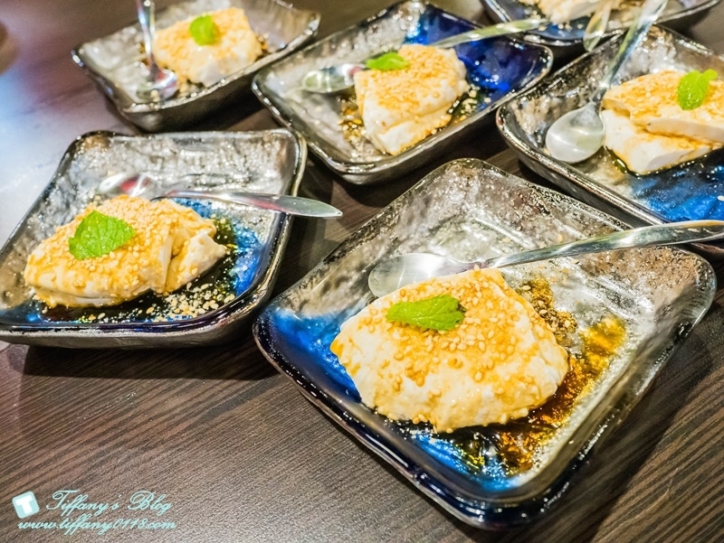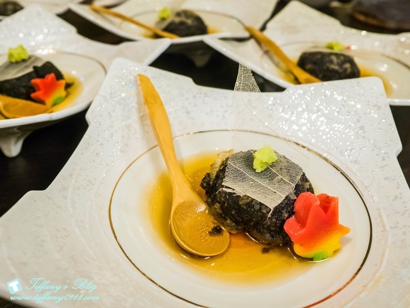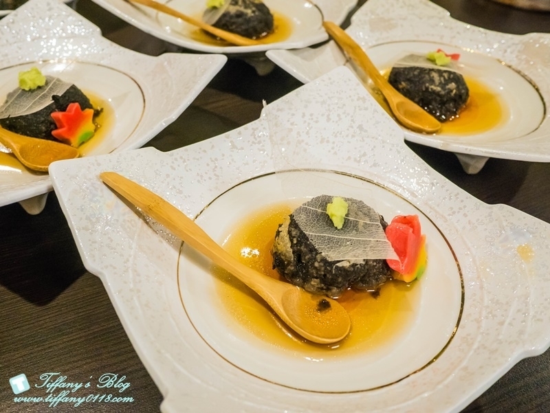 如果你是很愛吃芝麻的人應該會很喜歡這道,我覺得它的口感很特別,上層是用日本進口的葉子做裝飾(不能食用喔!!),然後再加上一點新鮮芥末,黑胡麻豆腐本身外皮是有點酥脆感的,所以入口後會有2種口感,先吃到外皮的酥黏後,緊接著是豆腐本身的軟綿,再來是黑芝麻的香氣,算是滿有層次的味道~~