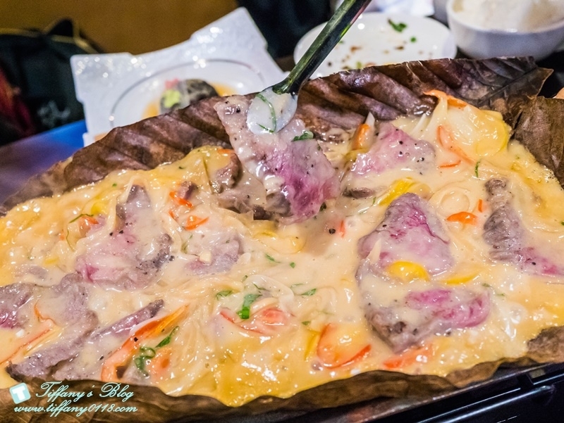 在鐵板上滋滋作響的牛肉一端上桌我口水都要流下來了!!服務人員馬上來翻面,說因為這牛肉非常新鮮所以建議當牛肉變成粉紅色的時候就可以吃了~~