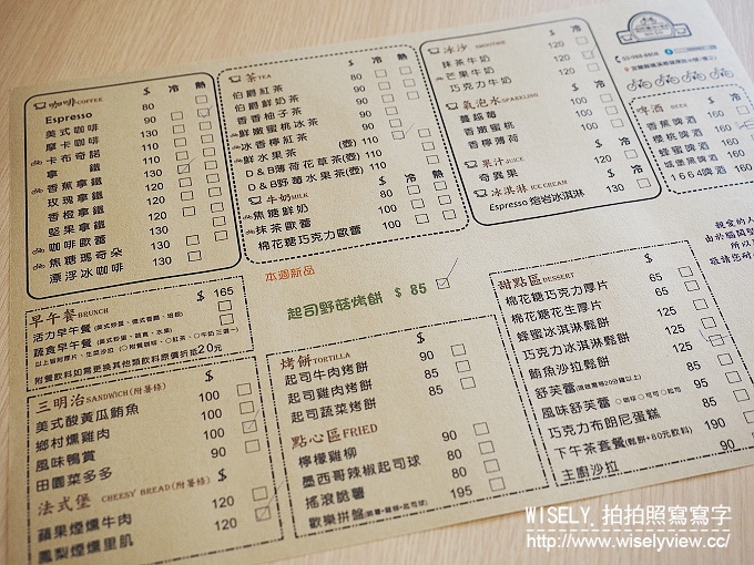 來此的低消NT100,如果是騎單車前來的話則打9.5折,不過下午茶則無折扣;餐點內容有咖啡冷飲、早午餐、輕食與甜點等等,平均每人的消費大約NT100~200左右,並且還有提供WiFi網路和插座,很適合在消磨上一整天。