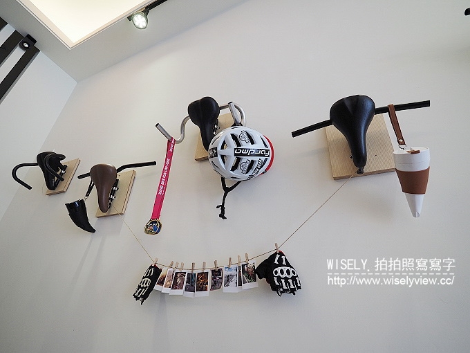 牆面上的單車都是真的可以騎乘的自行車,而另一側的牆面上則是以車把與座墊組合成的裝置藝術掛在上頭,並且還有車隊活動的拍立得記錄照片。
