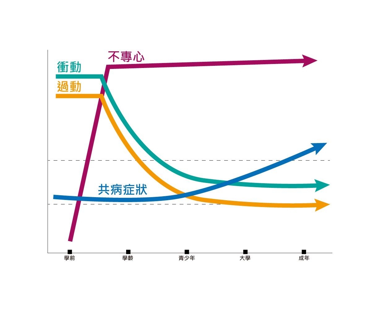 (ADHD的三大特徵:「不專心、衝動、過動」與年齡的關係,修改自《賴奕菁的精神科診所筆記》)