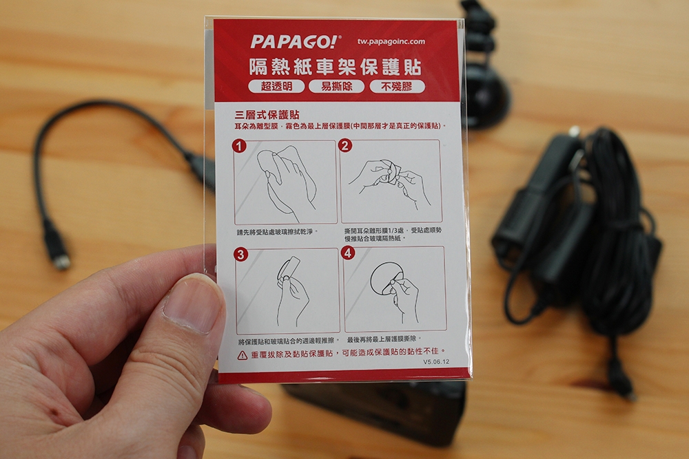 除了行車記錄器本體之外,各類包含的配件有兩種固定支架,看是喜歡吸盤固定或是採用 3M 貼,因為有的人會怕傷害到隔熱紙,這部份 PAPAGO! 還滿貼心的。線材部分包含了車用充電線,特別的是這次還提供了 OTG 傳輸線,可以直接在你的手機看到實錄畫面,並能直接讀取上傳社群網站。
