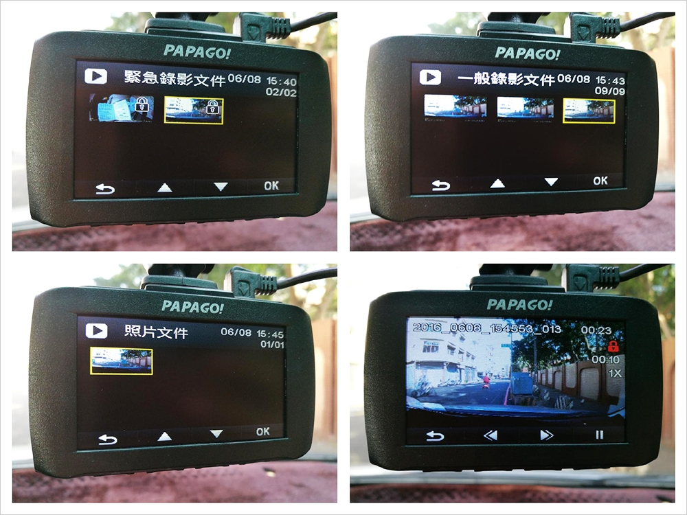 如需在車上就進行記錄查詢時,我們也可以直接在行車記錄上觀看,像是不能被刪掉的「緊急錄影文件」或是「一般錄影文件」和「照片」,都可以直接在上面播放,或者利用前面提過的 OTG 方式在手機上觀看。