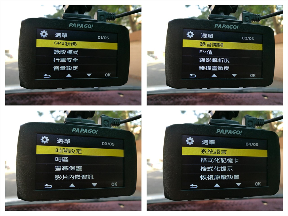 有些使用習慣設定,我們可以在選單中做選擇,從 GPS 狀態、錄影模式、行車安全到音量設定或是錄影畫面常使用的錄音開關、EV 值、錄影解析度和碰撞靈敏度,這些都可以在裡面做設定。