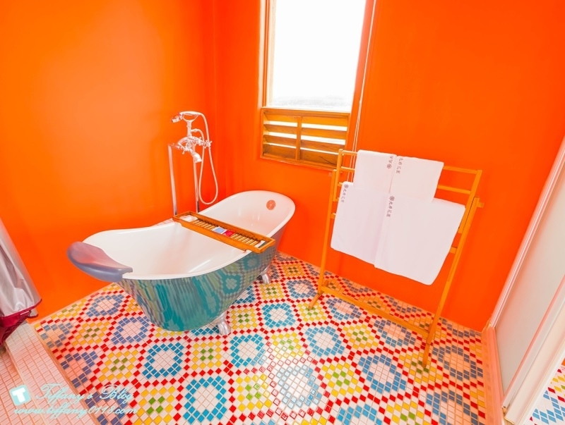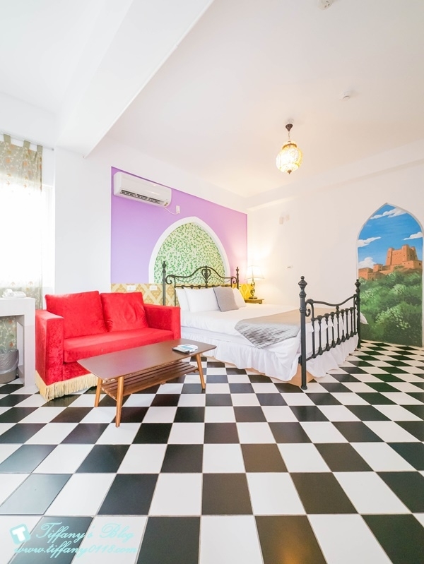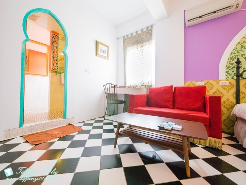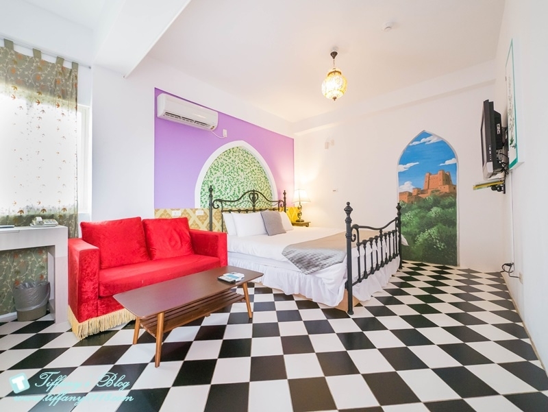 我喜歡這裡的每一間房型都有不同的風格,看起來簡單的雙人房,地板的黑白格配上紅色沙發,紫色的油漆加上其他不同色彩的點綴,在衝突感中又不失和諧
