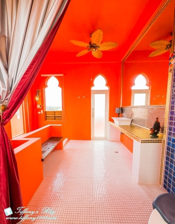 走上磚紅色的樓梯後,會看到超級無敵大的浴室空間