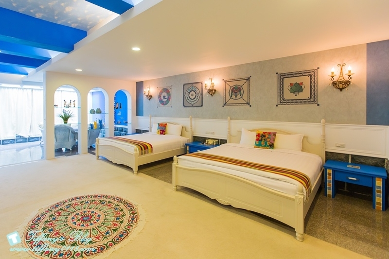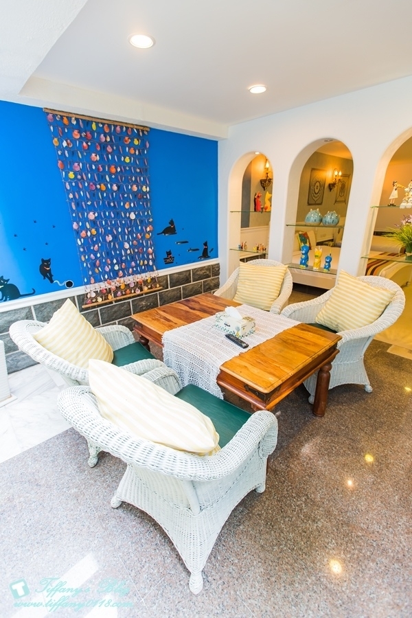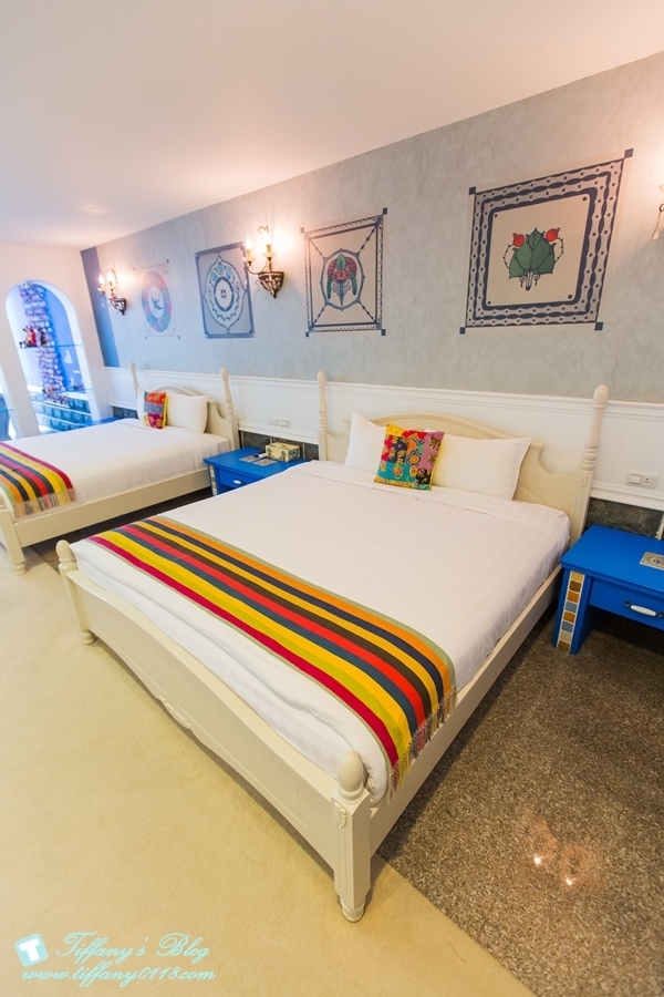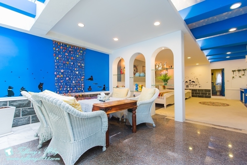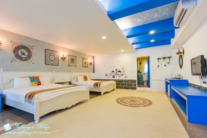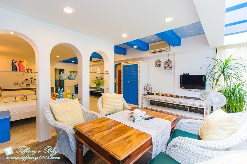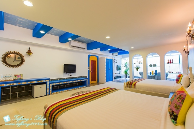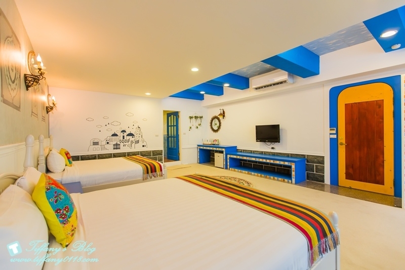 希臘風格的藍白色系讓人一眼就愛上這間房間,除了兩張大雙人床外,客廳空間也超大,而且還有兩台電視,所以杰寶就一個人坐在客廳的椅子上看他的幼幼台,我跟阿尼就看我們的綜藝節目完全不會互搶~真好XDDD