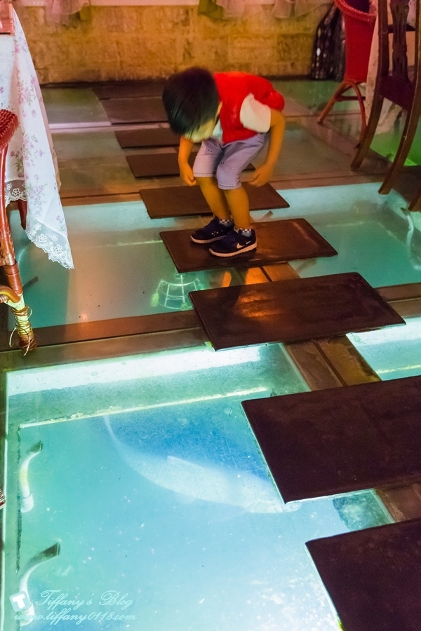 一進去貓腳印看到的是像餐廳式的格局,特別的是腳下有一格一格透明的玻璃,白天好像看不到什麼,但是一到晚上才發現,裡面有魚ㄝ!!!而且是非常大的~~~