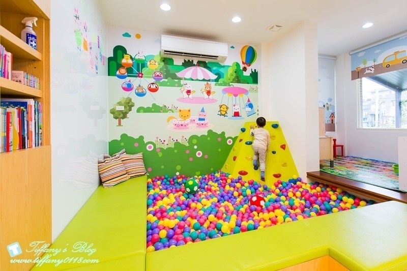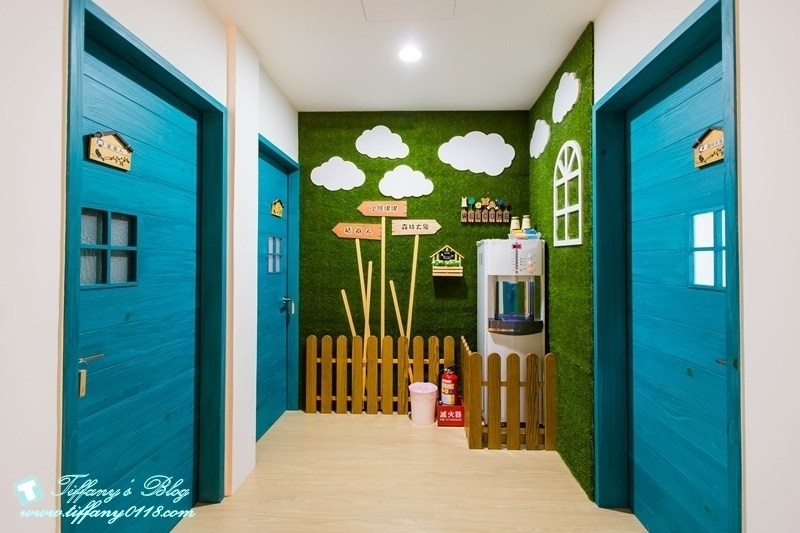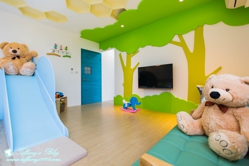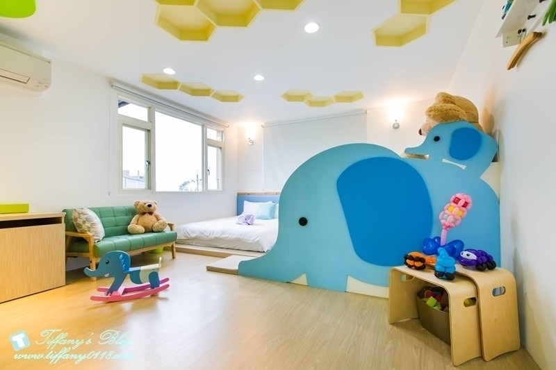 很喜歡這間森林大象的配色,牆壁上有綠色系的樹木造型,搭配藍色系的大象溜滑梯,一整個感覺好清新又舒服!!