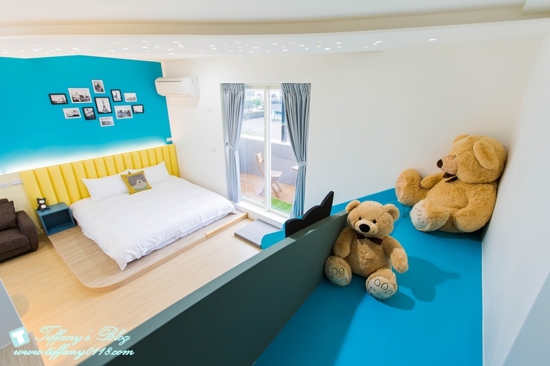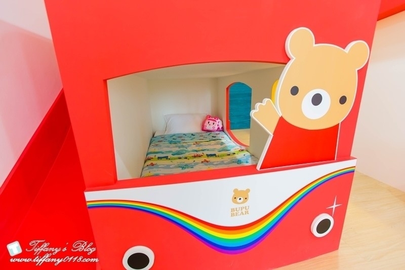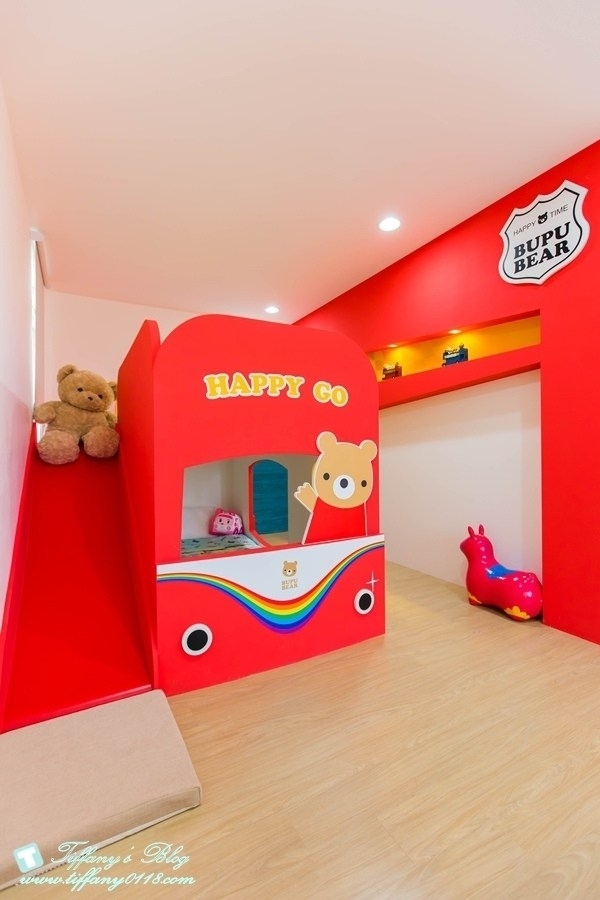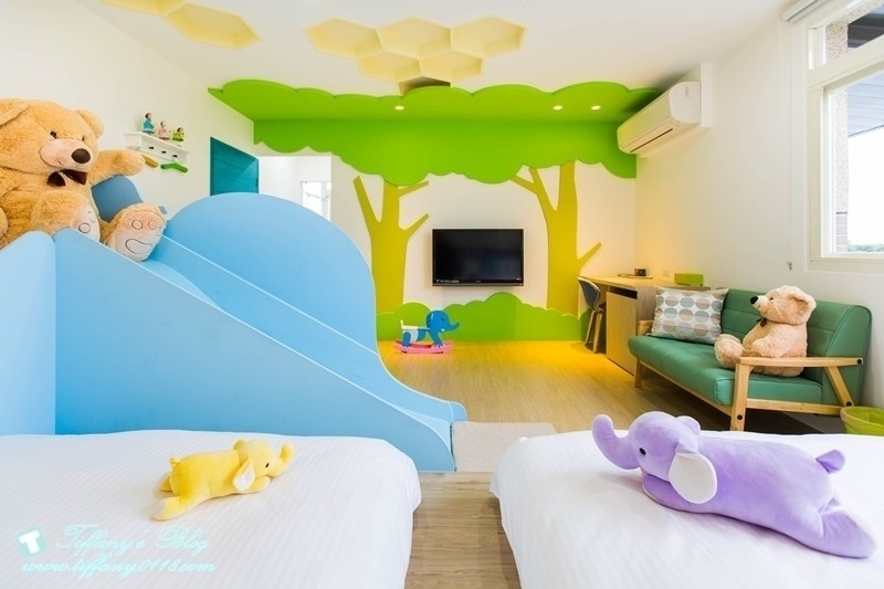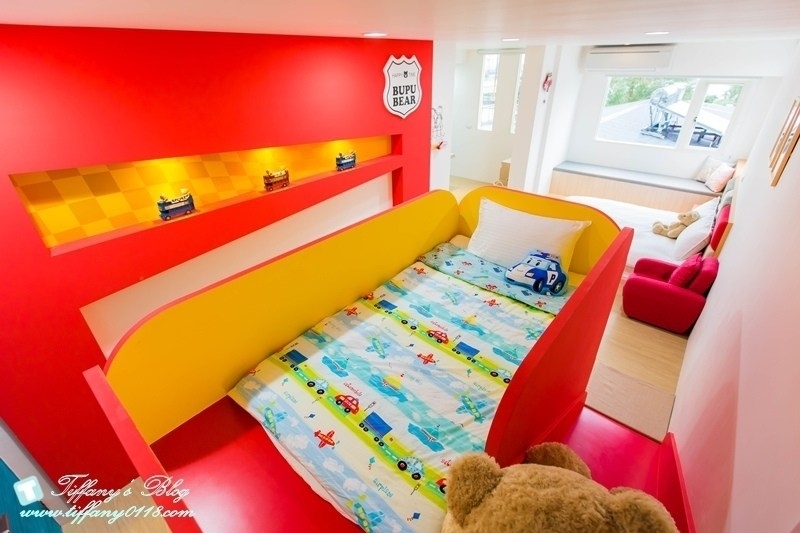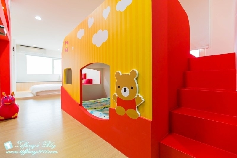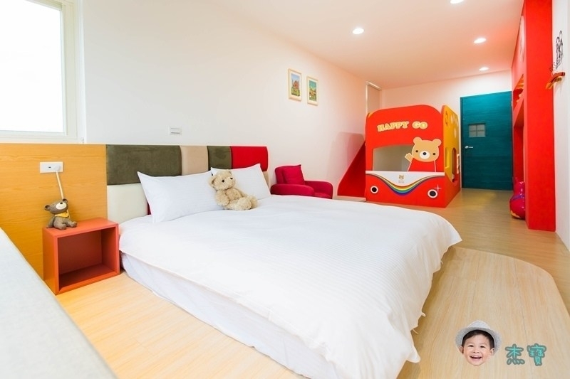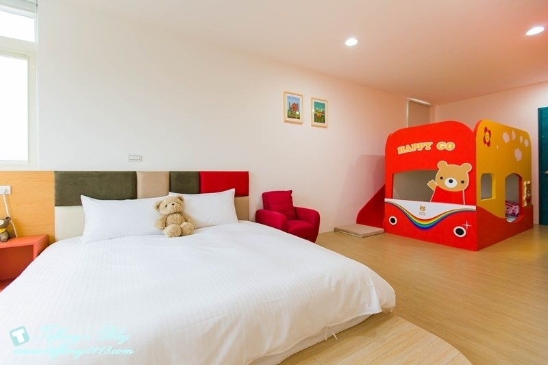 這間小熊噗噗的溜滑梯做成像一台可愛的車子一樣,吸晴度100%,有一張加大的雙人床跟二張兒童床,特別的是還有一張按摩沙發椅