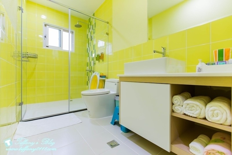 浴室的部分是綠色系的,沒有浴缸然後是乾濕分離
