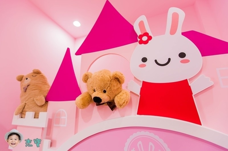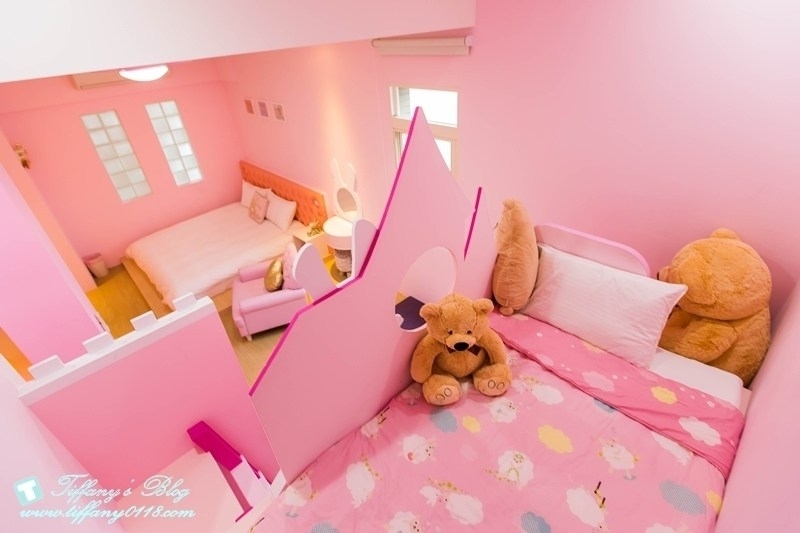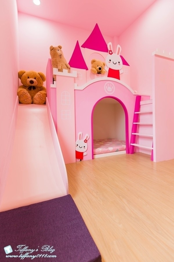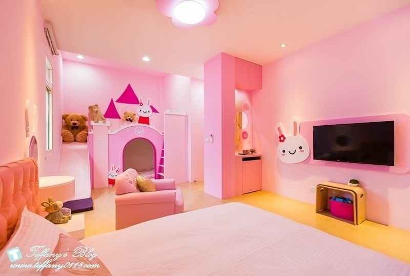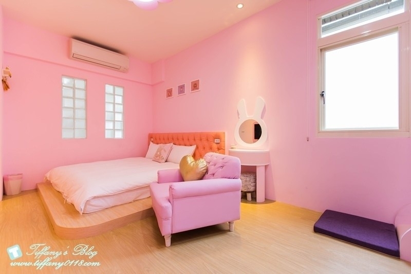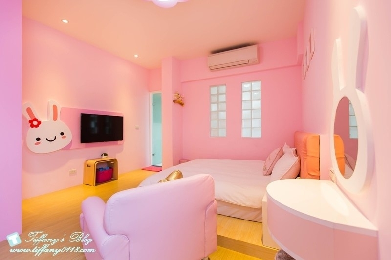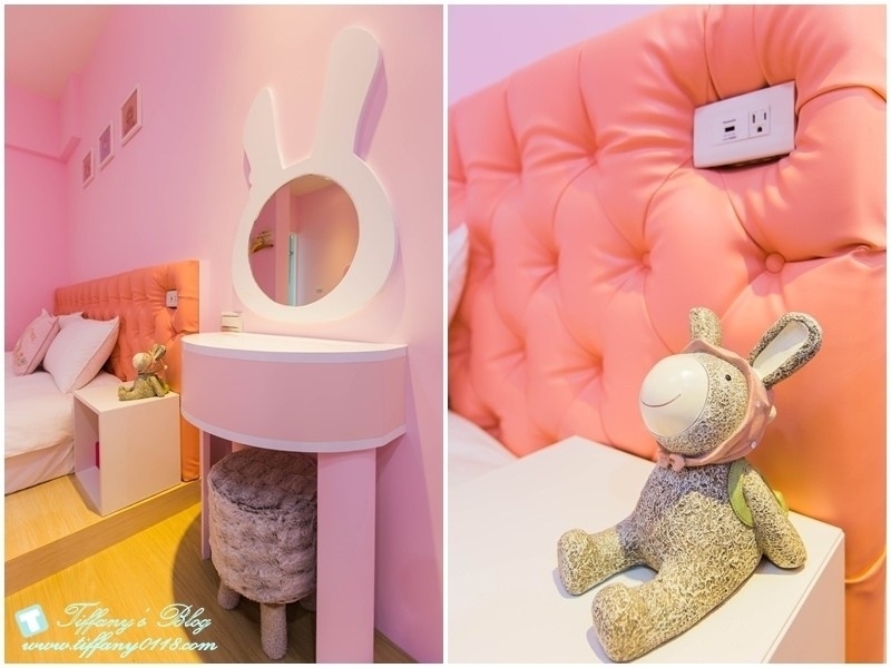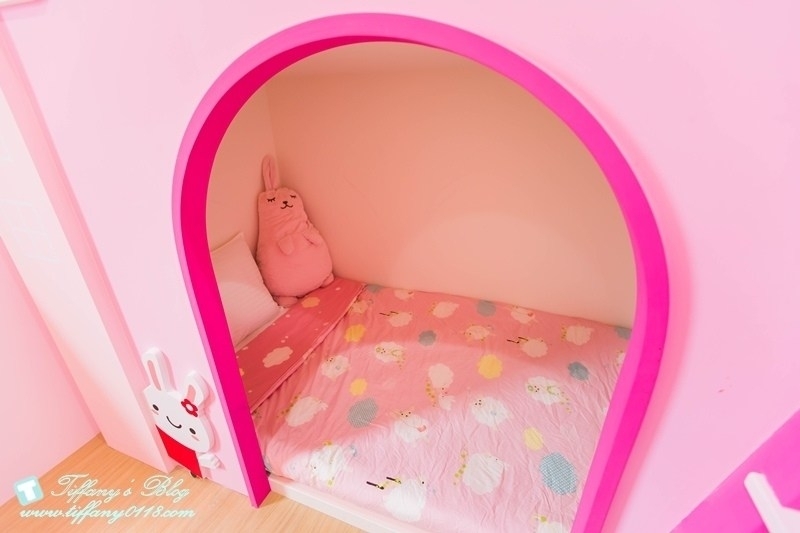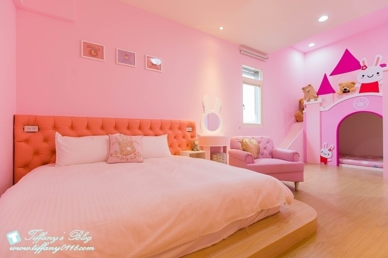粉色系的兔子城堡應該是小女生的最愛~有一張加大的雙人床,還有2張兒童床,滿適合一家四口入住的!!