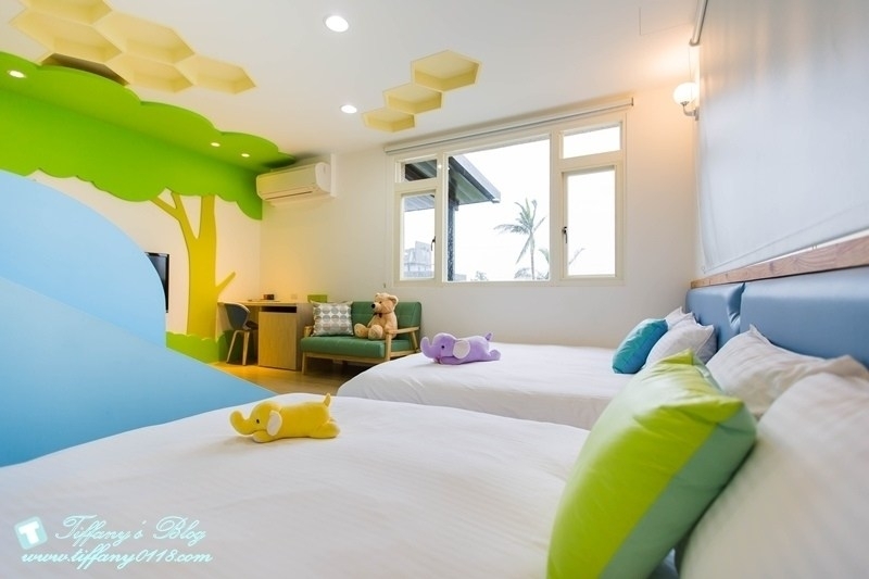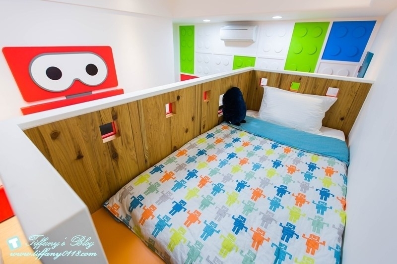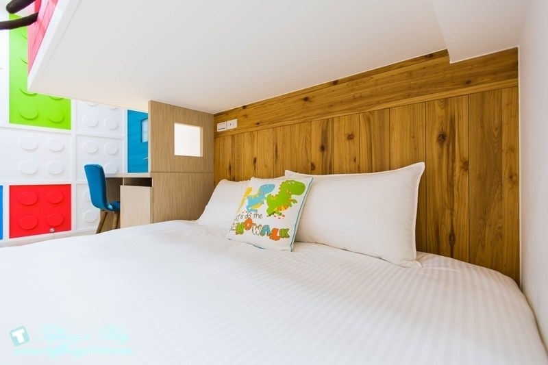 房間裡有一張加大雙人床跟一張兒童床,牆壁上有積木造型,很喜歡這間房型的巧思,不管是男生還是女生都很適合