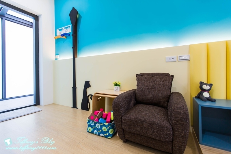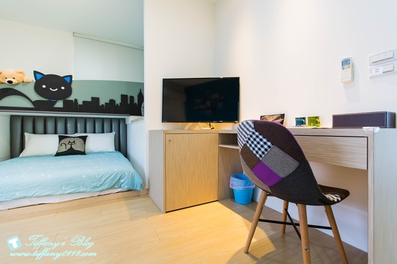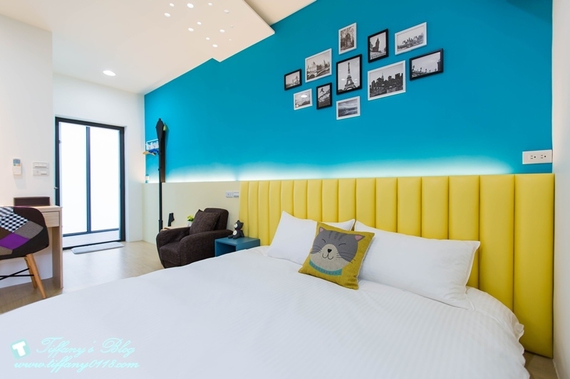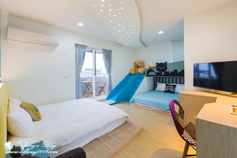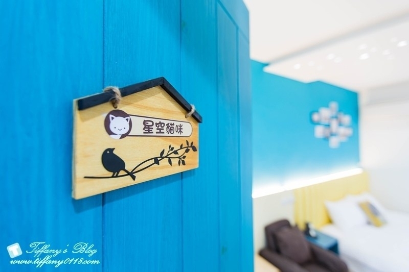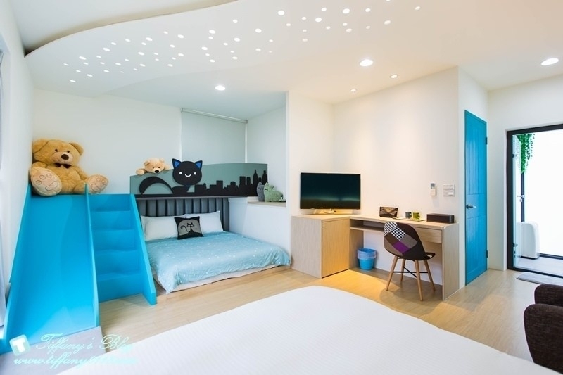 這間星空貓咪親子房很特別,室內空間很大,裡面是一張加大雙人床跟一張標準雙人床,藍白色系感覺很清新