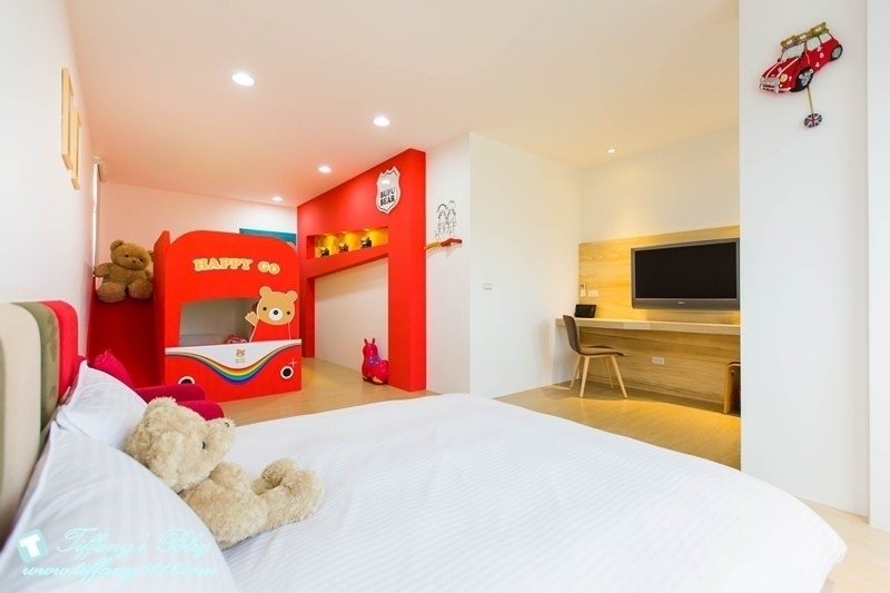 其實在很多 細節上可以感受到民宿的用心,像剛才積器人的房型,兒童床的床單就是機器人圖案的,像這間小熊噗噗的話就是用車車的床單