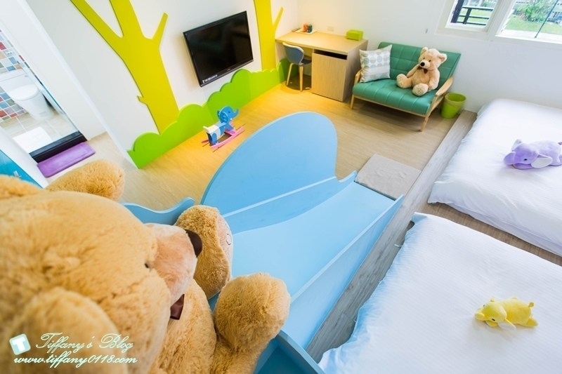 因為是四人房所以空間還滿大的,小朋友可以把溜滑梯當作秘密基地,然後玩樂跟睡覺都在這裡,應該一進房就不想出來了….