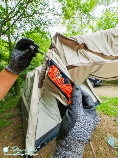 到這邊其實帳篷組裝已經完成99%了,因為我們是第一次搭所以花了點時間,不過比起一般的帳篷真的好搭非常多!!而且我覺得TURBO Tent在很多細節上面都滿貼心的,像接下來的步驟是要把外帳的營繩抽出來跟四個角的角釘固定,才能讓外帳更加穩固~而營繩是有一個專門的小袋子裝著,在拿取上非常方便…