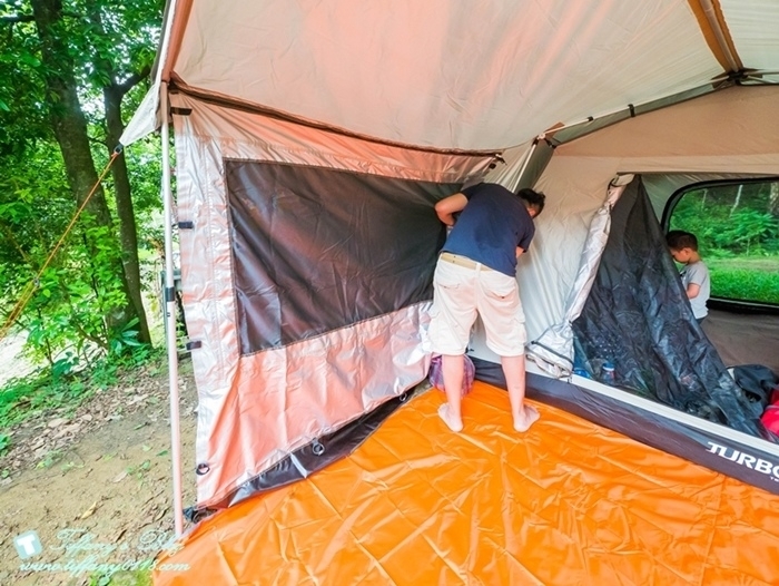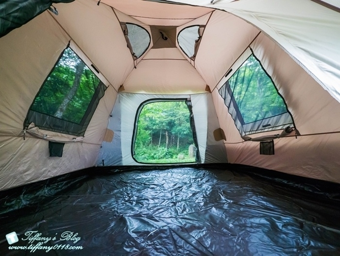 固定完營繩後~外帳就完成了,而整頂帳篷也就這樣搭建完成!!老實說我原本以為阿不就是一頂帳篷而已,沒想到搭完之後阿尼開始跟我介紹起這頂帳篷的優點和一些貼心的裝置,一般我們印象中的帳篷都是很悶熱的對吧!!想像它不過就是一塊密不通風的帆布蓋在上面的意思XD這頂TURBO Tent Lite 300的帳內空間非常大,因為是8人帳~300*300的睡帳空間真的很舒適,我們當初考量不想要一家三口擠在小小的帳篷空間裡,所以才會一開始就直上Turbo lite 300,再來是它每一面都有開窗(外層有紗網) ,天氣好了時候打開其實是很通風的~~然後連上面也都有天窗喔….整頂內帳的通風感是很好的!!
