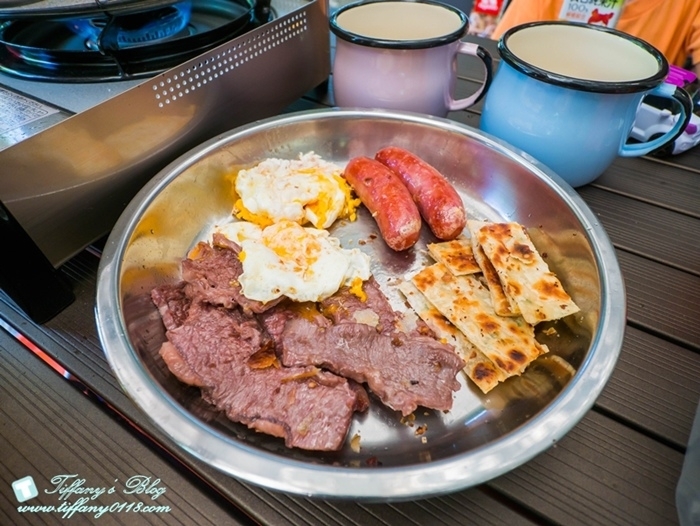 隔天的早餐我們隨意吃,利用昨天烤肉剩下來的香腸跟牛肉和原本買的蔥油餅一起當作一餐