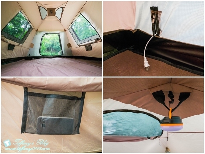 再來包括它前門跟後門旁都有防蟲電源線導入孔,畢竟在帳篷裡你還是會需要接電,可是電線總不可能從正門的拉鍊縫隙穿出來或是從帳篷開一個洞吧,所以有了電源線導入孔之後,就不用擔心會有蚊蟲從縫隙溜進來內帳的危險了…另外左右兩側有置物袋,你可以放手機之類的東西我覺得很方便~再來是頂部有掛燈,不用擔心晚上的時候內帳沒有光線的問題了!!