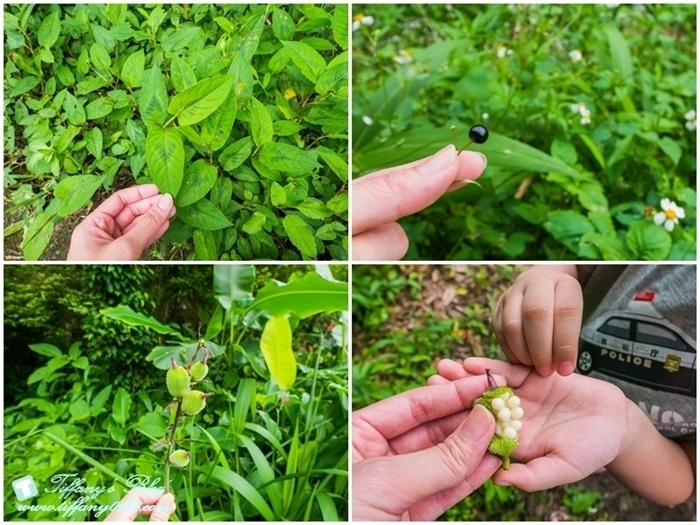 照片的左上角是俗稱救命植物的”火炭母草”他的莖部酸酸的可以幫助分泌唾液,在危急的時候救你一命,照片右上角是龍葵,是一種可以吃的菜,有些人會用來煮粥…照片下方是原生種”美人蕉”