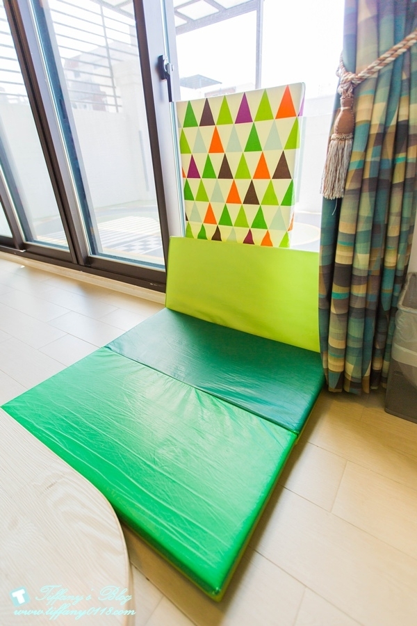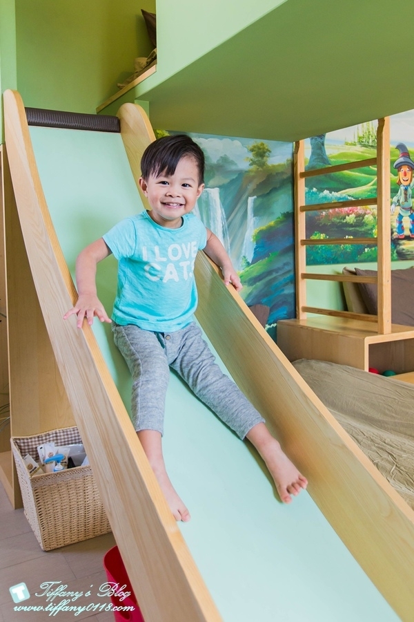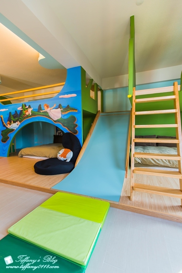 杰寶看到溜滑梯當然二話不說馬上衝上去,坡度的部份對他現在2Y多的年紀來講還是稍微有點陡,不過迪利小屋二館很貼心地在溜滑梯下方有鋪設緩衝墊,這是我在其他溜滑梯民宿沒有看見過的