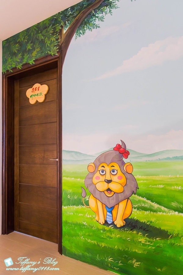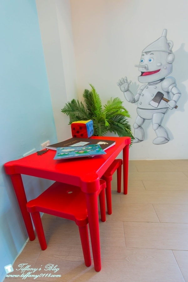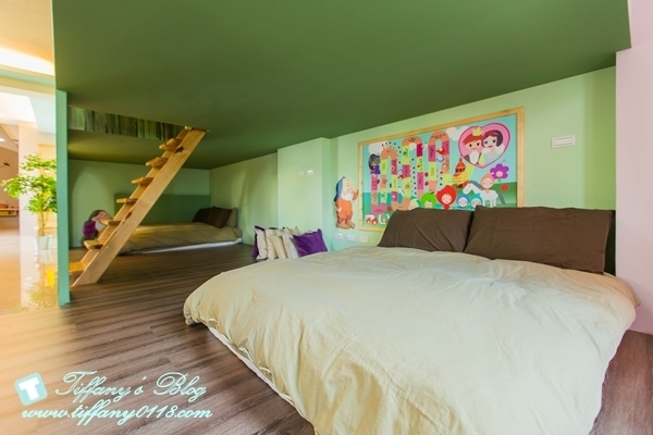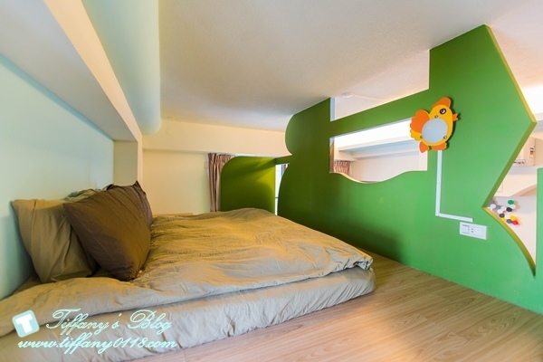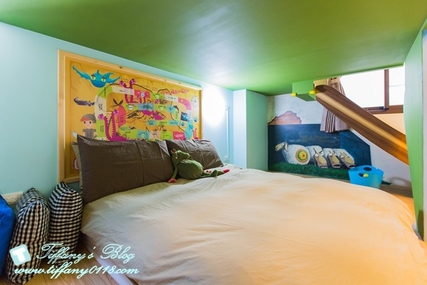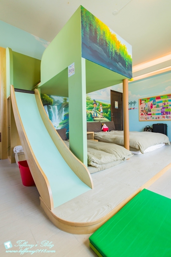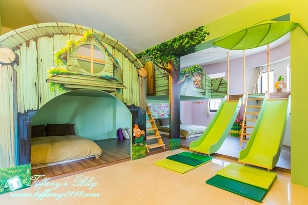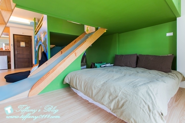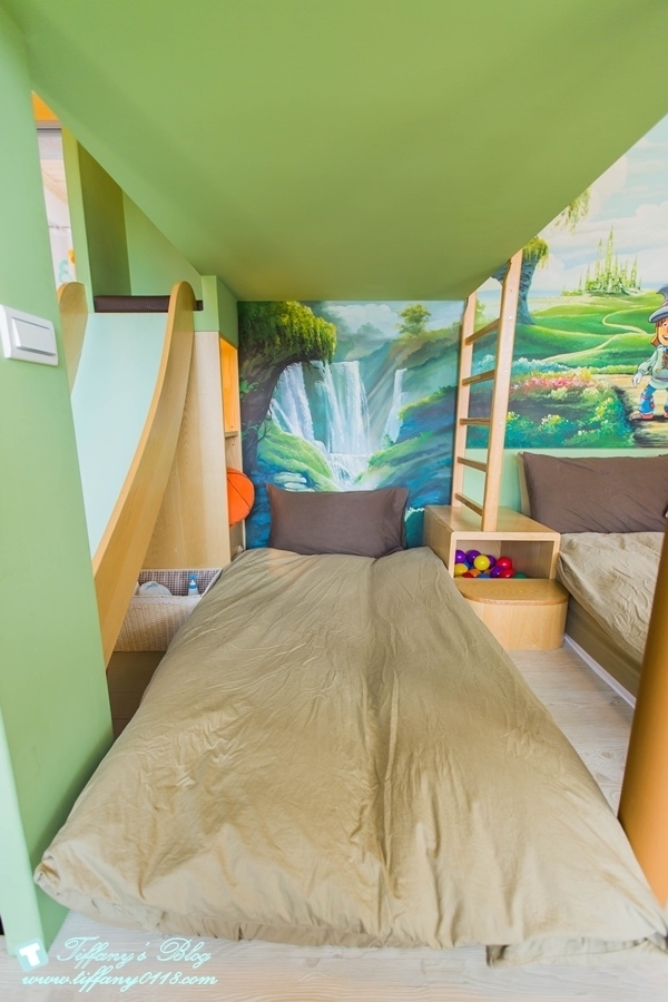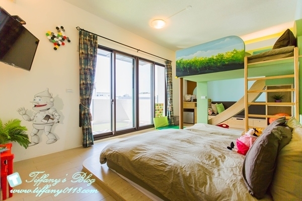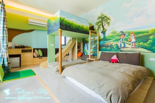 迪利小屋二館的房間從門口開始就很特別,像我們入住的這間綠野仙蹤,大家都知道綠野仙蹤裡面的主角除了桃樂絲以外,還有獅子~稻草人~錫樵夫和狗兒嘟嘟,所以還沒進門就可以看到其中一個主角”獅子”在門口迎接了^^一打開門我跟小王子都發出了驚呼聲XD,9坪大小的空間有著一張大床跟一個大溜滑梯,清新的綠色系好符合綠野仙蹤的森林冒險感