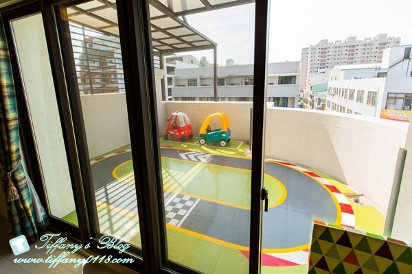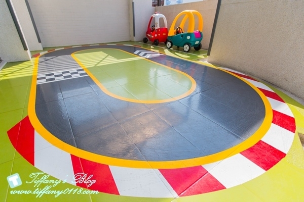 沒錯!!就是綠野仙蹤房型有戶外5坪大的賽車道!!!這對小男生來說簡直就是夢想阿~~~杰寶一進房先驚呼溜滑梯之後看到戶外的賽車道馬上就瘋了一直大喊”我要騎車車!!!”