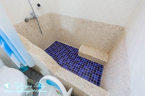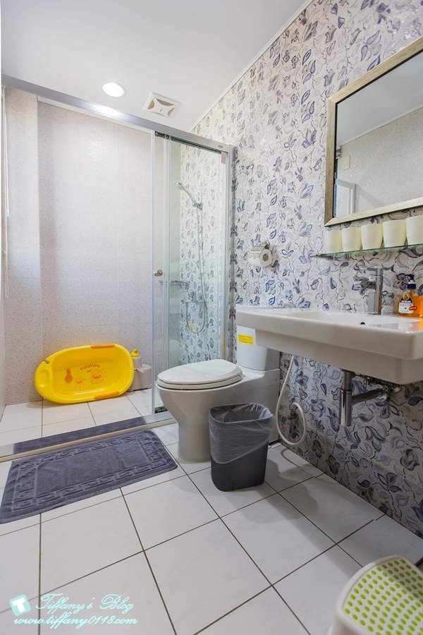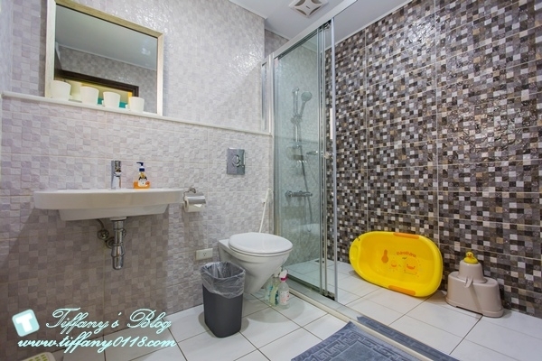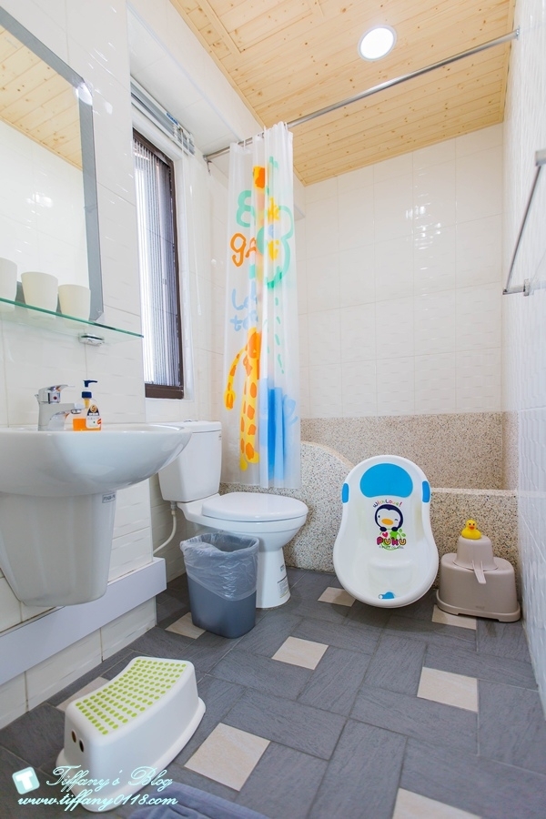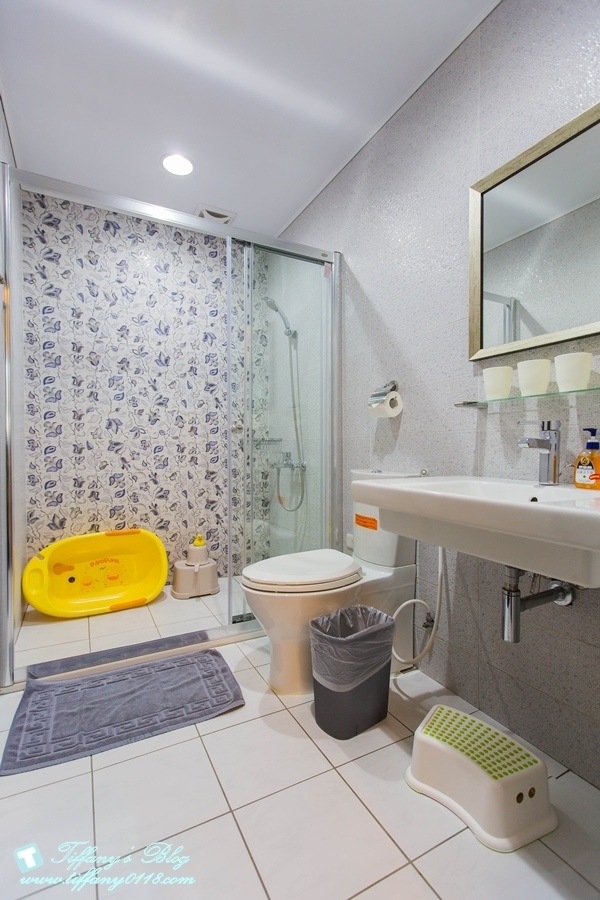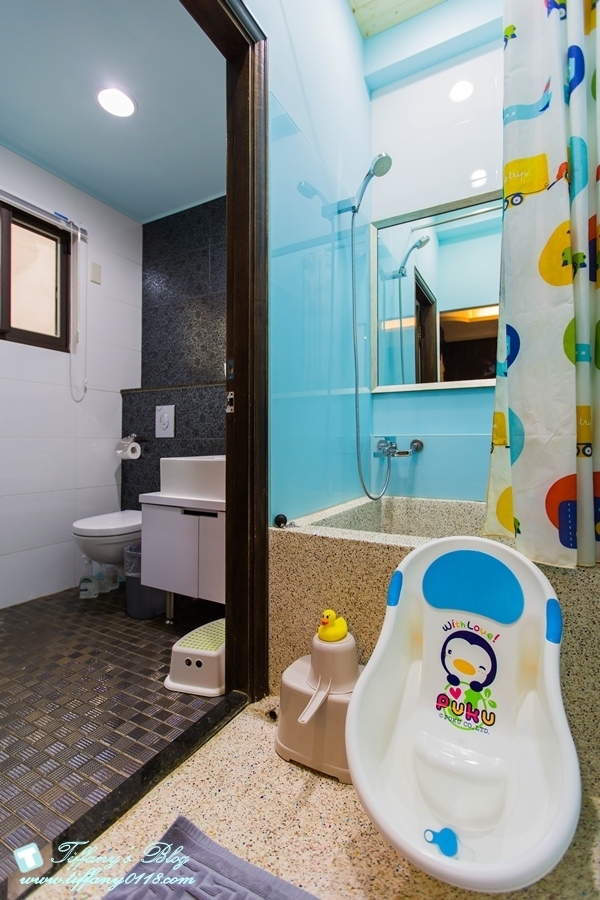 浴室的部份我也很喜歡,有一個大浴池,但是要把水漏滿的話應該需要滿久的時間,因為實在太大了….全家人都可以一起泡在裡面~然後也提供澡盆跟小椅子,像我之前去住民宿,每次要帶杰寶去廁所洗手都會遇到一個問題就是杰寶不夠高,我要一邊抱著他一邊幫他洗手,老實說非常費力>///<但迪利小屋連這種小地方都設想到了,真的讓我在心中又默默大加分阿!!