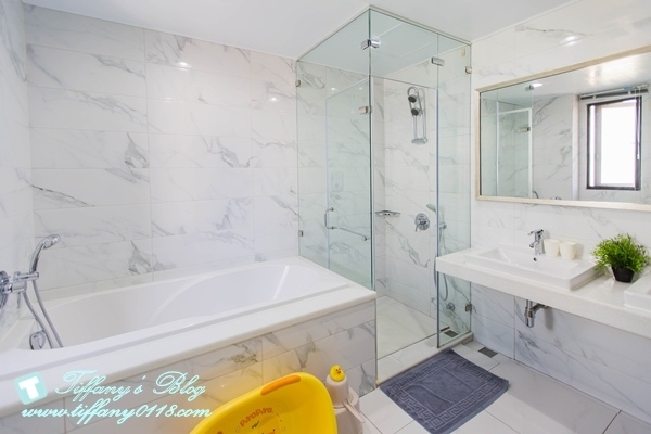 浴室的部分是有浴缸的,大理石牆面有質感又素雅