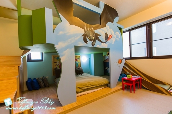 溜滑梯的造型很特別,是從龍的背上溜下來,室內約10坪大,很適合一家三口的小家庭入住