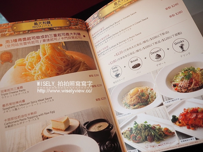 翻了一下菜單,內容以起司為中心去推出多項的料理,像是義大利麵、披薩、燉飯及甜點等等,平均價格也滿親民的,大約消費約在NT300~350左右另加一成。