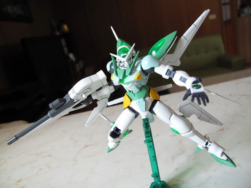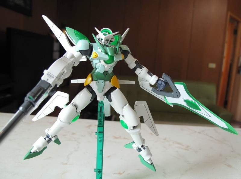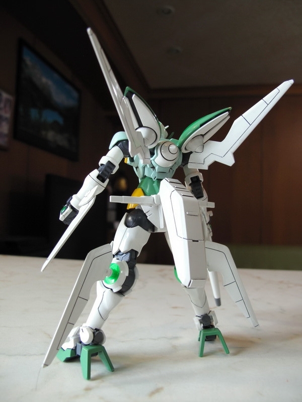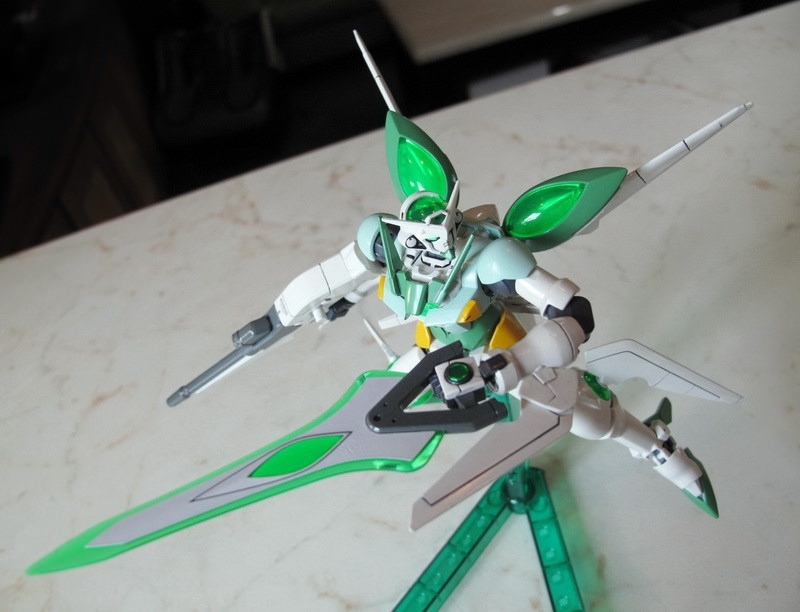 劍的表面與手甲這種精細的地方,還是用貼紙會省事得多模型本身嘛,首先是被調整成九等身的外型,要說帥氣自然不在話下,偏偏就與它應有的妖精形象不太合拍,感覺就不對咧….不管這個的話,本款不僅有大量的透明綠零件(甚至還附了腳架)又有很夠的可動範圍,確實也是款相當夠水準的套件。