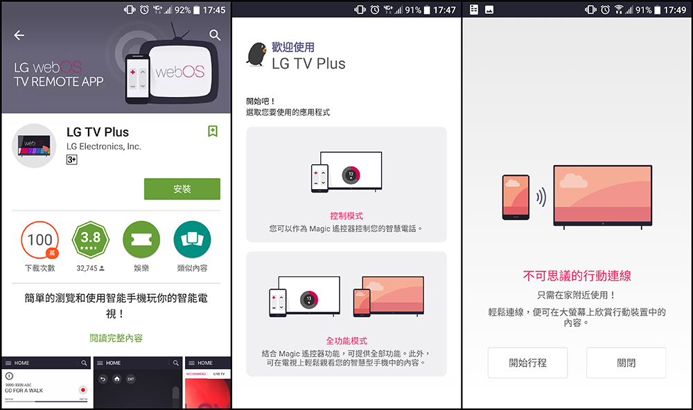 另一個相當實用的功能就是使用行動裝置,只需要連上  Wi-Fi,就能將內容投射到電視上或者藉由手機來操作電視,舒服地在大螢幕上享受影音娛樂。我們也可以在行動裝置上安裝 LG TV Plus 的應用程式,或照著電視連線教學步驟掃描 QR Code 即可。