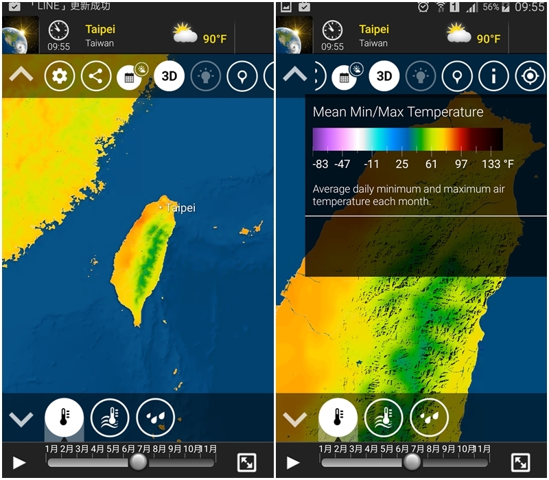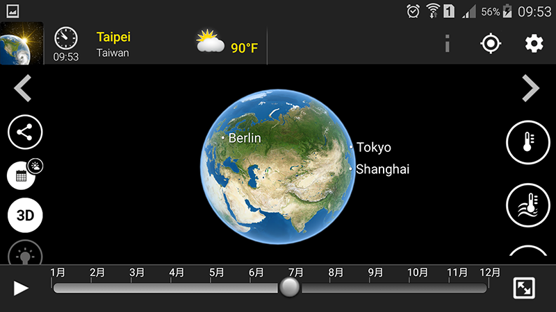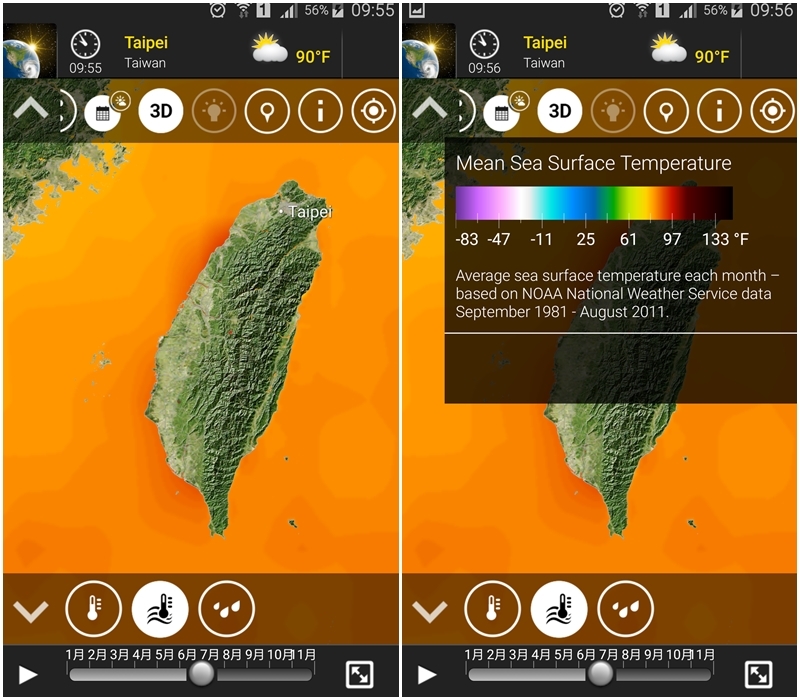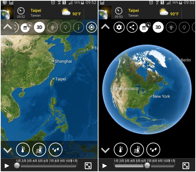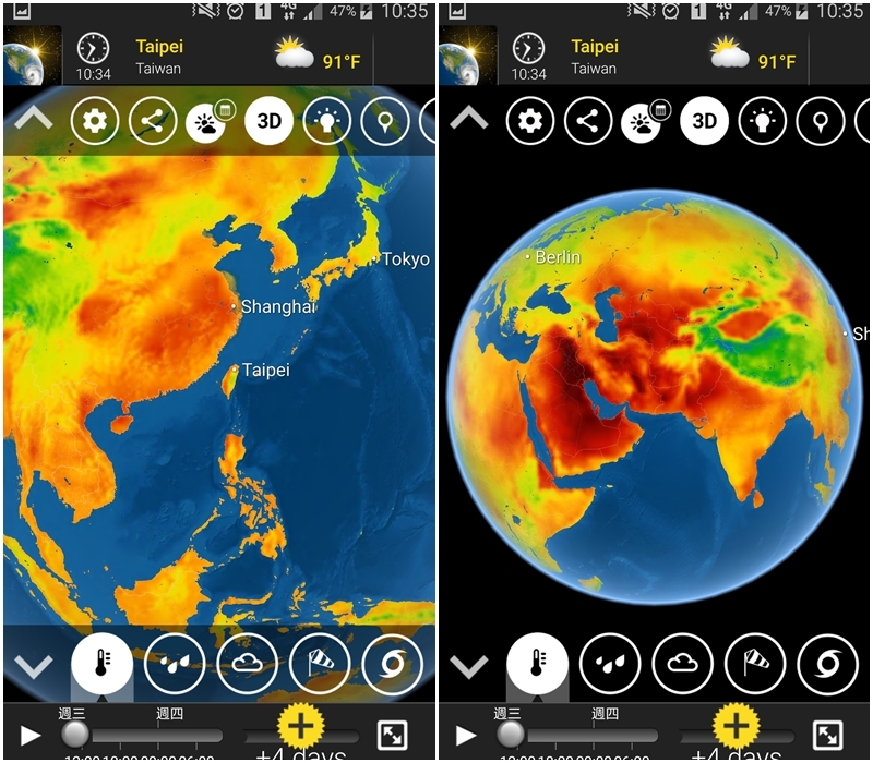 基本呈現方式有兩種一種是平面,就像左邊一樣,而另一種則是 3D 也就是說我們可以利用手指頭去旋轉地球,就像在看地球儀一樣。