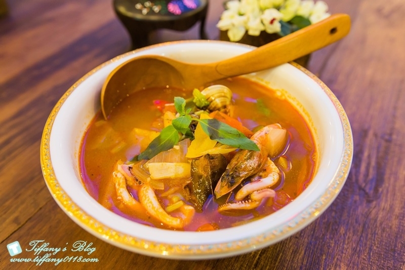 這道海鮮酸辣湯應該算是泰國的”冬央貢”就是酸酸辣辣的口味,裡面海鮮料滿多的,辣度跟酸度也夠….