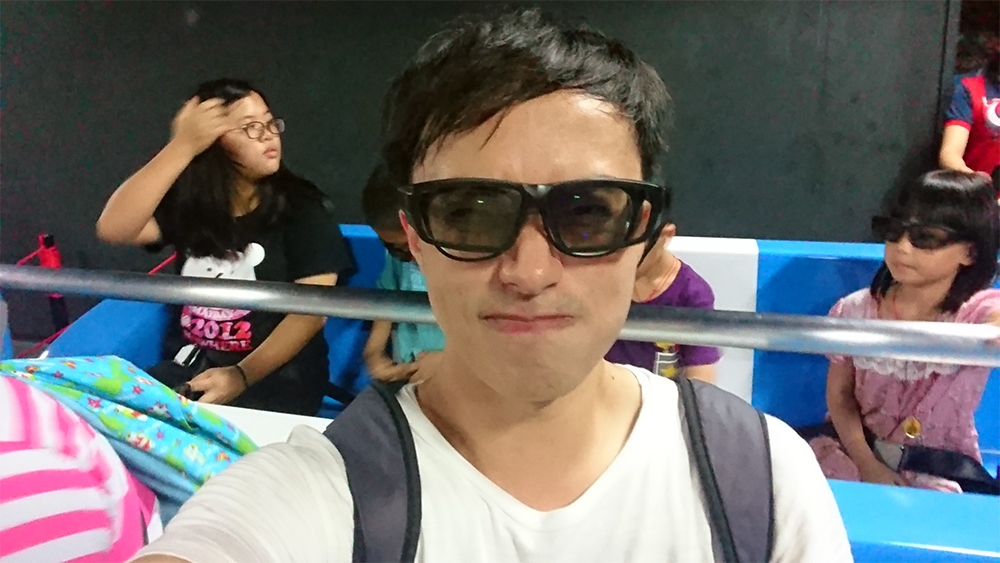 我自己先玩了「競速卡丁車」,哇!整個是閃電麥坤的 FU~因為在這邊的畫面和過程是不能拍照的,只好在開始前自拍一下戴 3D 眼鏡的樣子,因為裡面設施很多都是「不能說的祕密」,一定要過來親身體驗才感受得到啦!