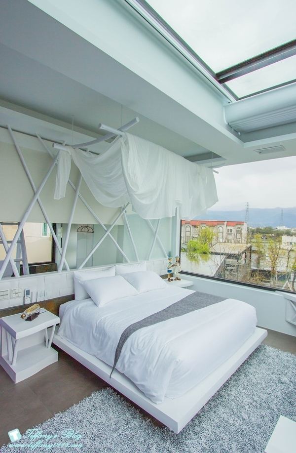 超大空間的雙人房型….一樣有遙控布幔天窗和超廣闊視野的大片玻璃,白色基調搭配藍色的點綴擺飾讓人像置身浪漫峇里島裡~~