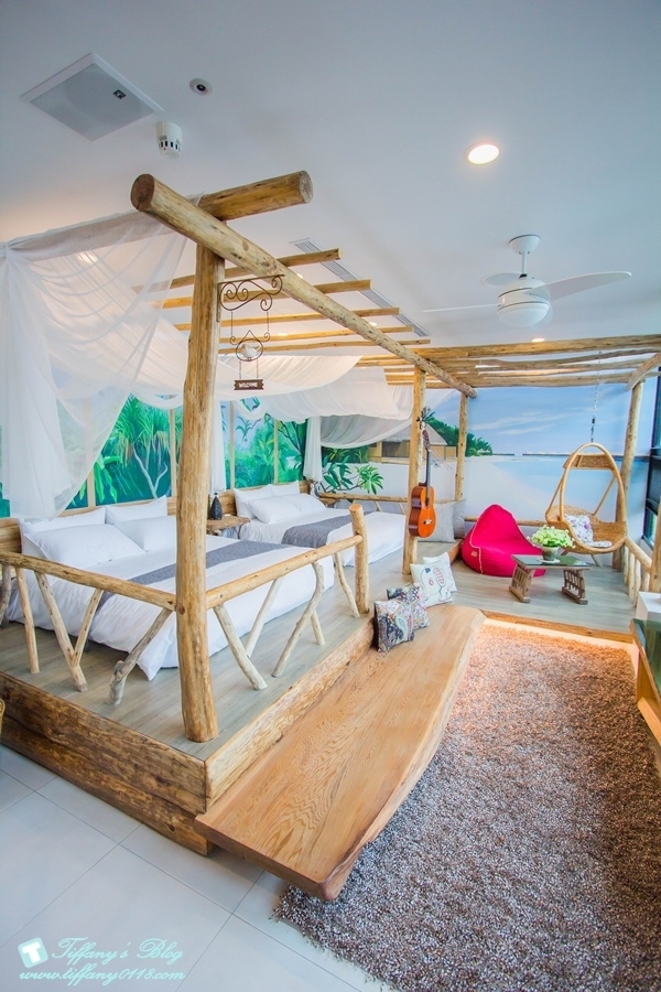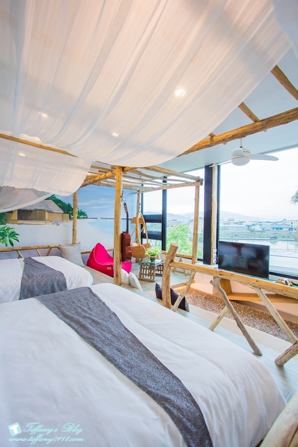 剛才有提到水岸楓林民宿的3樓有三間新蓋好剛開放入住的主題房型,這間巴里‧峇里就是其中一間,也是目前水岸楓林所有房型裡面空間最大最寬敞的,雖然是四人房~但我覺得可以睡到6人都沒問題啦!!因為房間位在3樓,所以有布幕天窗可以遙控開關,天氣好的夜晚待在房間裡抬頭就可以仰望繁星…最大面積的開窗設計也讓整間房間看起來更大更舒適,我超~~~喜歡這間巴里‧峇里的