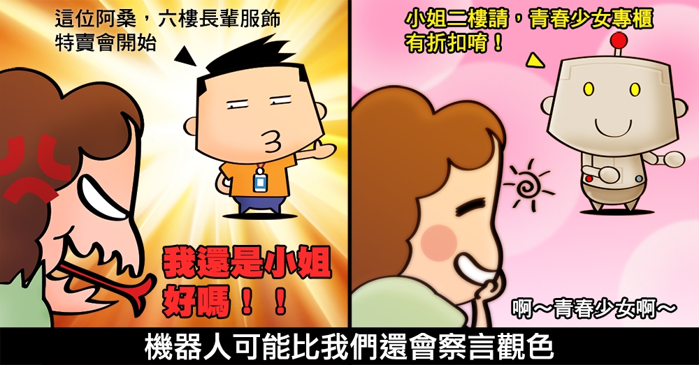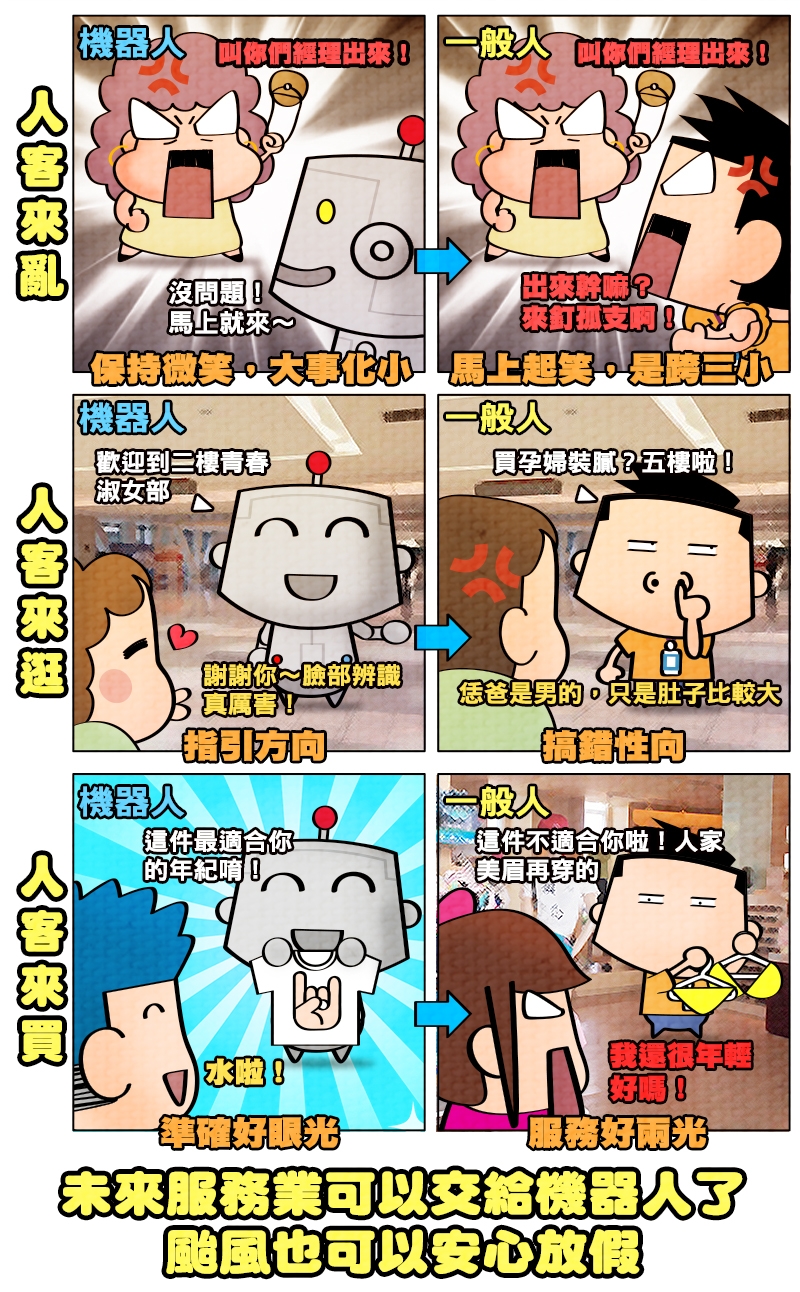 當一個人進到百貨公司,機器人可以掌握他的年齡、性別或其他個人特質,比對後便能進行精確的指引,適合到哪一個樓層,並提供準確的促銷資訊,這正是接待服務最需要的一環呢!