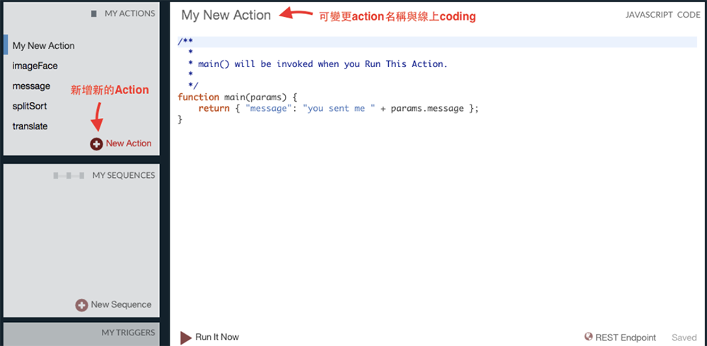我覺得最大的特色是在這個介面下不用去考慮整個 IT 基礎架構,在上面就可以進行開發和測試,大幅簡化工作內容,都可以在線上編輯,只需要專心針對部分 function 的細節做好連結,或在事件觸發器(Trigger)上綁好要執行的動作就可以了!