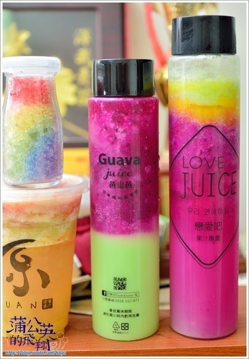 哇~一次買三杯/瓶!一網打盡?咦….沒有耶!有兩瓶都是『戀愛吧』的,於是我又感佩又覺得有點可惜的說:其實離『戀愛吧』很近還有一家『芭樂芭』,也是賣漸層飲料的呢!