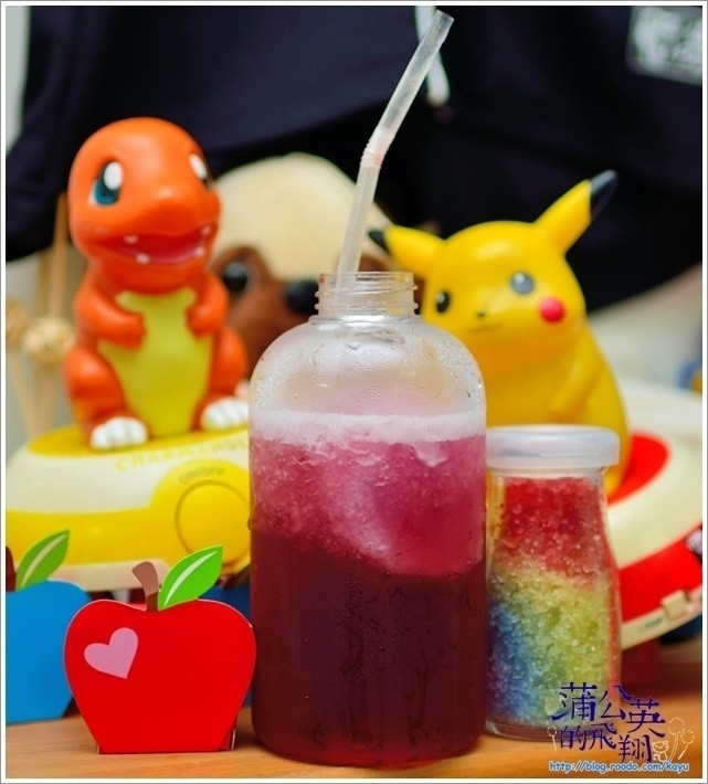 中間的是碎冰,下層則是個葡萄和蘋果混的果醋,K同事說:味道還不差,酸酸甜甜的,但上方的蝶豆沒味道,然後蝶豆水,可能是比較輕,是做在冰塊上,中間白色的是冰塊,然後下層是果醋。